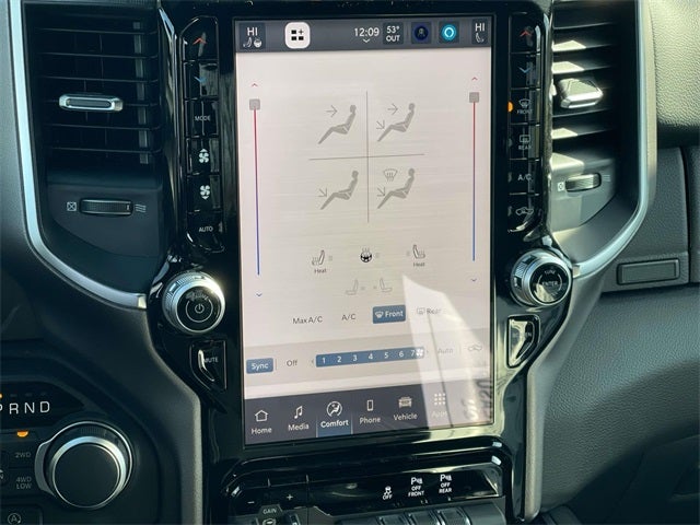 115V Auxiliary Power Outlet, 115V Auxiliary Rear Power Outlet, 12 Touchscreen Display, 2nd Row in Floor Storage Bins, 3 Rear Seat Head Restraints, 4 Way Front Headrests, 400W Inverter, 4G LTE Wi-Fi Hot Spot, 9 Amplified Speakers with Subwoofer, Accent Color Door Handles, Accent Color Premium Power Mirrors, Accent Color Tailgate Handle, Air Conditioning ATC with Dual Zone Control, Anti-Spin Differential Rear Axle, Apple CarPlay, Auto Power-Folding Mirrors, Auto-Dimming Exterior Driver Mirror, Auto-Dimming Rear-View Mirror, Bed Utility Group, Big Horn Level 2 Equipment Group, Black Exterior Mirrors, Black Exterior Truck Badging, Black Headlamp Bezels, Black Interior Accents, Black Painted Exterior Mirrors Caps, Black Premium Power Mirrors, Black Tail Lamp Bezels, Body Color Fender Flares, Body Color Front Bumper, Body Color Rear Bumper with Step Pads, Bucket Seats, Center Console Parts Module, Cluster 7.0 TFT Color Display, Configurable Drive Mode, Connected Travel and Traffic Services, Connectivity - US/Canada, Convex Wide-Angle Exterior Mirror Insert, Deluxe Cloth Bucket Seats, Disassociated Touchscreen Display, Dual Exhaust with Black Tips, Exterior 115V AC Outlet, Exterior Mirrors Courtesy Lamps, Exterior Mirrors with Heating Element, Exterior Mirrors with Supplemental Signals, Front Seat Back Map Pockets, Full Length Floor Console, Global Telematics Box Module, Glove Box Lamp, Google Android Auto, GPS Antenna Input, GPS Navigation, Grille Black Surround Black Mesh, HD Radio, Heated Front Seats, Heated Steering Wheel, Integrated Center Stack Radio, Integrated Voice Command with Bluetooth®, Leather Wrapped Steering Wheel, LED Dome Lamp with on/Off Switch, LED Footwell Lighting, Manual Adjust 4-Way Front Passenger Seat, Media Hub with 2 Charge Only USBs, MOPAR 4 Adjustable Cargo Tie-Down Hooks, MOPAR Spray in Bedliner, Night Edition, Overhead LED Lamps, Pick-Up Box Lighting, Power 2-Way Driver Lumbar Adjust, Power Adjust 8-Way Driver Seat, Power Adjustable Pedals, Premium Overhead Console, Quick Order Package 27Z Big Horn, Radio: Uconnect 5 Navigation with 12.0 Display, RAM Grille Badge - Black, Rear 60/40 Folding Seat, Rear Center Armrest, Rear Power Sliding Window, Rear Window Defroster, Remote Tailgate Release, Security Alarm, SiriusXM Radio Service, SiriusXM with 360L, Steering Wheel Mounted Audio Controls, Sun Visors with Illuminated Vanity Mirrors, Universal Garage Door Opener, USB Host Flip, Wheels: 20 x 9.0 Aluminum Painted Clad, Wheels: 20 x 9 Aluminum Chrome Clad.
