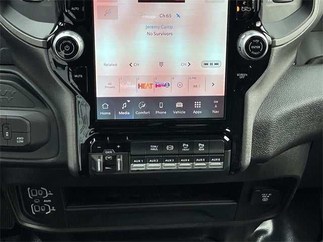 115-Volt Auxiliary Front Power Outlet, 12 Touchscreen Display, 2 Way Rear Headrest Seat, 4 Way Front Headrests, 40/20/40 Split Bench Seat, 400W Inverter, 4G LTE Wi-Fi Hot Spot, Air Conditioning ATC with Dual Zone Control, Alexa Built-in, Anti-Spin Differential Rear Axle, Apple CarPlay, Auto Power-Folding Mirrors, Auto-Dimming Rear-View Mirror, Bed Convenience Group, Black Exterior Mirrors, Blind Spot and Cross Path Detection, Bright Front Bumper, Bright Rear Bumper, Carpet Floor Covering, Center Hub, Center Stop Lamp with Cargo View Camera, Chrome Grille Surround, Cloth 40/20/40 Bench Seat, Connected Travel and Traffic Services, Connectivity - US/Canada, Disassociated Touchscreen Display, Emergency Vehicle Alert System (EVAS), Exterior 115V AC Outlet, Exterior Mirrors Courtesy Lamps, Exterior Mirrors with Heating Element, Exterior Mirrors with Supplemental Signals, For Details, Visit DriveUconnect.com, For More Info, Call 800-643-2112, Forward and Reverse Utility Lights, Front and Rear Floor Mats, Front Armrest with Cupholders, Global Telematics Box Module, Google Android Auto, GPS Antenna Input, GPS Navigation, HD Radio, Integrated Voice Command with Bluetooth®, LED Bed Lighting, LED Tail Lamps, Manual Adjust 4-Way Driver Seat, Manual Adjust 4-Way Front Passenger Seat, Manual Folding Exterior Mirrors, Matte Black Mesh Grille with Chrome, Mirror Running Lights, Mopar Black Tubular Side Steps, MOPAR Spray in Bedliner, Off-Road Info Pages, ParkSense Front/Rear Park Assist System, Power Adjust Mirrors, Power Heated Folding Telescope Mirrors, Power Heated Folding Telescopic Mirrors, Power Telescoping Mirrors, Power-Adjustable Convex Aux Mirrors, Quick Order Package 24A Tradesman, Quick Order Package 2UA Tradesman, Radio: Uconnect 5 Navigation with 12.0 Display, Rear Folding Seat, Rear Power Sliding Window, Red Tail Lamp Bezels, Remote USB Port - Charge Only, Selectable Tire Fill Alert, SiriusXM Radio Service, SiriusXM with 360L, Storage Tray, Surround View Camera System, Tinted Acoustic Windshield Glass, Towing Technology Group, Tradesman Level 2 Equipment Group, Trailer Reverse Guidance, Trailer Tire Pressure Monitoring System, Trailer Tow Pages, Wheels: 18 x 8.0 Steel Chrome Clad.