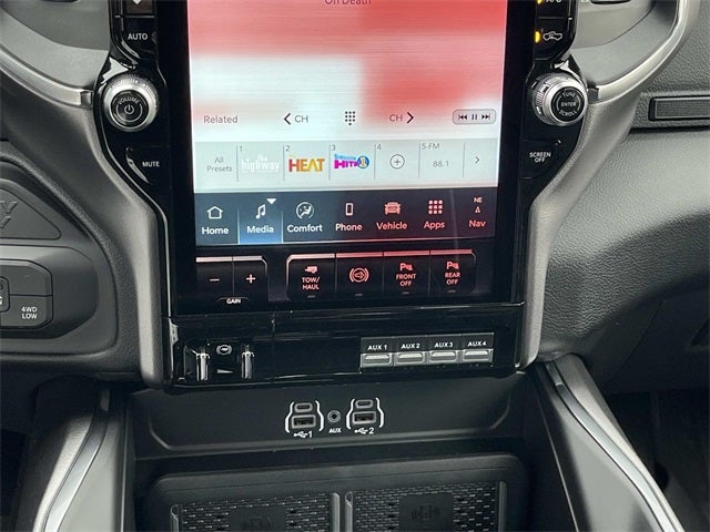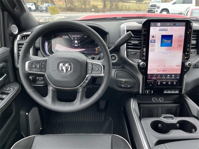#1 Seat Foam Cushion, 115V Auxiliary Rear Power Outlet, 14.4 Touchscreen Display, 17 Speaker Harman/Kardon Premium Sound, 2 Way Rear Headrest Seat, 2nd Row in Floor Storage Bins, 4 Way Front Headrests, 4G LTE Wi-Fi Hot Spot, Active Lane Management System, Adaptive Steering System, Alexa Built-in, Apple CarPlay, Auto Adjust in Reverse Exterior Mirrors, Auto Dimming Exterior Passenger Mirror, Auto High Beam Headlamp Control, Auto Power-Folding Mirrors, Auto-Dimming Exterior Mirrors, Black Exterior Mirrors, Black Exterior Truck Badging, Black Wheel Center Hub, Body Color Grille Surround, Bucket Seats, Center Stop Lamp with Cargo View Camera, Chrome Exterior Mirrors, Connected Travel and Traffic Services, Connectivity - US/Canada, Disassociated Touchscreen Display, Drowsy Driver Detection, Dual Wireless Charging Pad, Emergency Vehicle Alert System (EVAS), Exterior Mirrors Courtesy Lamps, Exterior Mirrors with Heating Element, Exterior Mirrors with Memory, Exterior Mirrors with Supplemental Signals, Foam Bottle Insert (door Trim Panel), Folding Flat Load Floor Storage, For Details Visit DriveUconnect.com, For More Info, Call 800-643-2112, Forward and Reverse Utility Lights, Front Seat Back Map Pockets, Full Length Upgraded Floor Console, Global Telematics Box Module, Gloss Black Grille Billets/Accents, Google Android Auto, GPS Antenna Input, GPS Navigation, HD Radio, Heated Front Seats, Heated Steering Wheel, High Back Seats, Integrated Voice Command with Bluetooth®, Laramie Level 2 Plus Equipment Group, Leather Trimmed Bucket Seats, LED Bed Lighting, Mirror Running Lights, MOPAR Deployable Bed Step, MOPAR Spray in Bedliner, Night Edition, Off-Road Information Pages, Power 2-Way Driver Lumbar Adjust, Power 2-Way Passenger Lumbar Adjust, Power Adjust 8-Way Driver Seat, Power Adjust 8-Way Front Passenger Seat, Power Adjust Mirrors, Power Adjustable Pedals with Memory, Power Deployable Running Boards, Power Heat Fold Memory Telescopic Mirrors, Power Telescoping Mirrors, Power-Adjustable Convex Aux Mirrors, Quick Order Package 24H Laramie, Radio: Uconnect 5 Nav with 14.4 Display, Rain Sensitive Windshield Wipers, Rear 60/40 Folding Seat, Remote Tailgate Release, Selectable Tire Fill Alert, SiriusXM Radio Service, SiriusXM with 360L, Sport Performance Hood, Surround View Camera System, Towing Technology Group, Traffic Sign Recognition, Trailer Reverse Guidance, Trailer Tire Pressure Monitoring System, Trailer Tow Pages, Wheels: 20 x 8.0 Black Painted Aluminum.