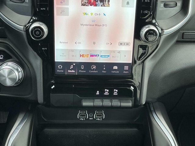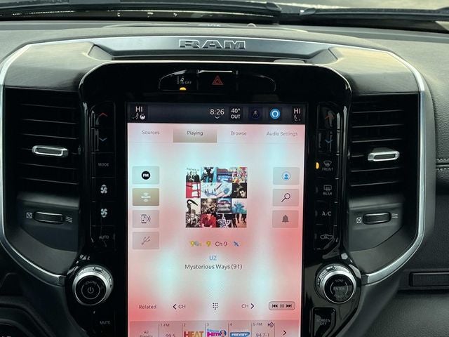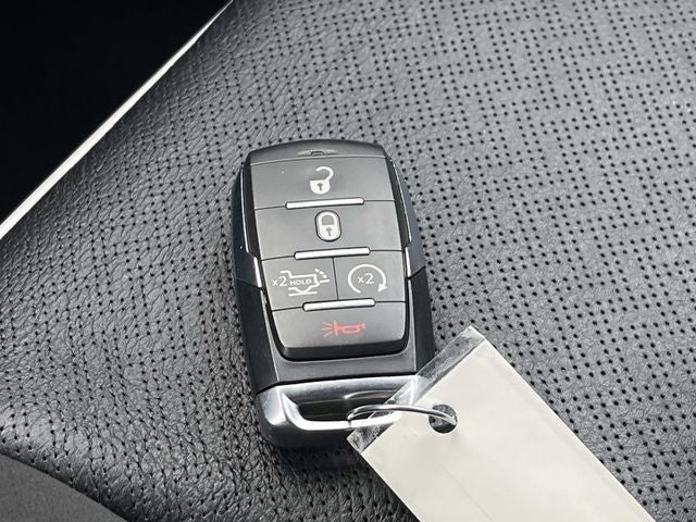 The interior of this Ram 1500 Laramie is equally impressive, with black leather-trimmed bucket seats, a power-adjustable driver's seat with memory, and heated front and rear seats for unparalleled comfort. The Uconnect 5 navigation system with a 12-inch display keeps you connected and informed, while the premium audio system with 10 speakers delivers an immersive listening experience.